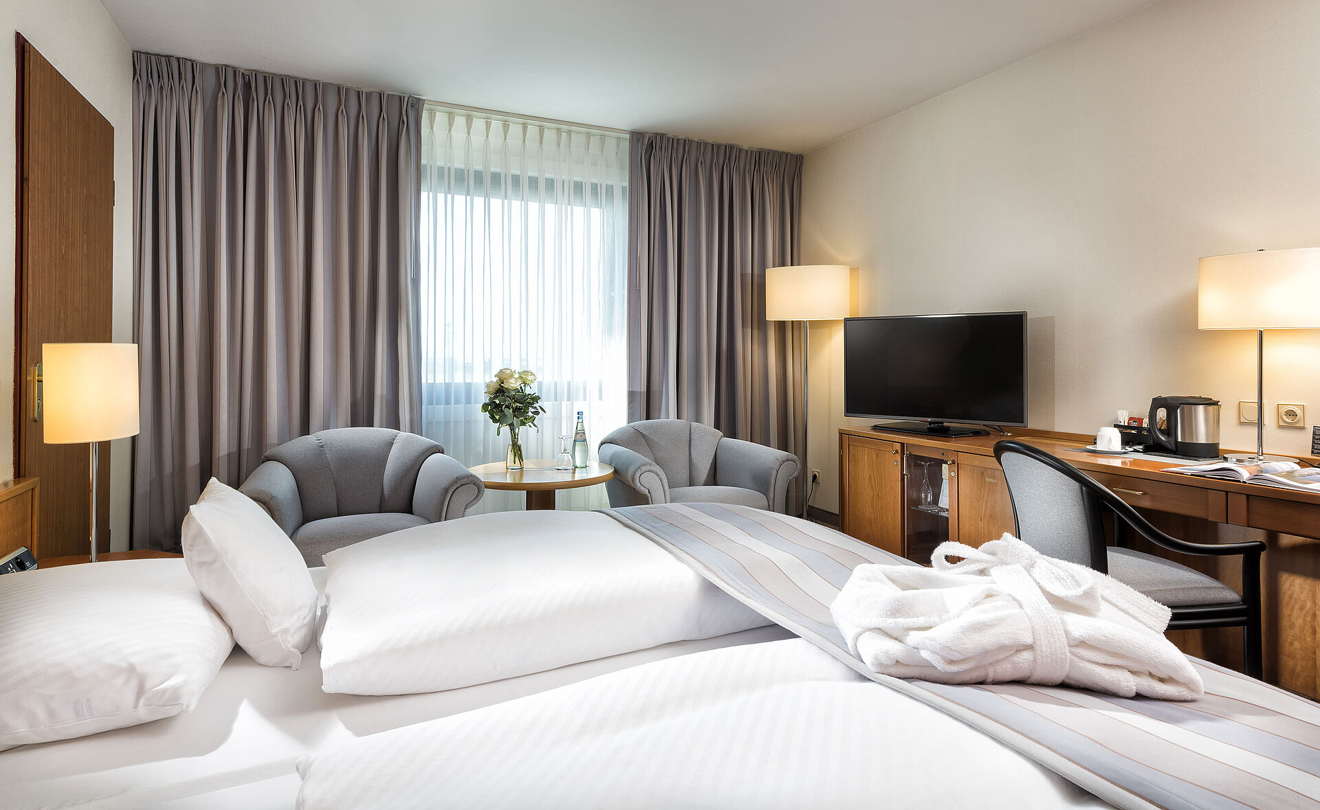 In direkter Anbindung an den Flughafen Hannover heißt Sie das elegante Maritim Airport Hotel in Hannover-Langenhagen herzlich willkommen. Durch die zentrale Lage und die unmittelbare Nähe zur Messe Hannover sowie zur Innenstadt erreichen Sie Ihre Ziele schnell und bequem mit öffentlichen Verkehrsmitteln – selbst wenn diese etwas entfernt liegen. Ganz gleich, ob Sie eine entspannte Nacht vor dem Abflug verbringen oder nach Ihrer Ankunft zur Ruhe kommen möchten: In unserem Hotel erwarten Sie moderner Komfort, herzlicher Service und das praktische Park, Sleep & Fly-Angebot für einen sorgenfreien Start in Ihre Reise. Doch auch die Stadt Hannover selbst ist einen längeren Aufenthalt wert. Erkunden Sie beliebte Sehenswürdigkeiten wie die Herrenhäuser Gärten, den Maschsee, den Erlebnis-Zoo oder das Alte und Neue Rathaus. In der Umgebung laden grüne Landschaften und ruhige Rückzugsorte zum Entdecken und Verweilen ein – perfekt für eine erholsame Auszeit vor oder nach Ihrer Reise. Zum Verweilen in Hannover laden die 527 modernen Nichtraucherzimmer und Suiten des Maritim Airport Hotel Hannover ein. Alle Zimmer sind schallisoliert und bieten Ihnen höchsten Komfort – mit Flachbildfernseher, kostenfreiem WLAN, einem Mini-Kühlschrank oder einer Minibar für erfrischende Getränke sowie einem Safe zur sicheren Aufbewahrung Ihrer Wertsachen. Für den kleinen Hunger zwischendurch erhalten Sie an der Rezeption eine Auswahl an Snacks. Zudem steht Ihnen dort ein Automat mit gekühlten Getränken rund um die Uhr zur Verfügung.