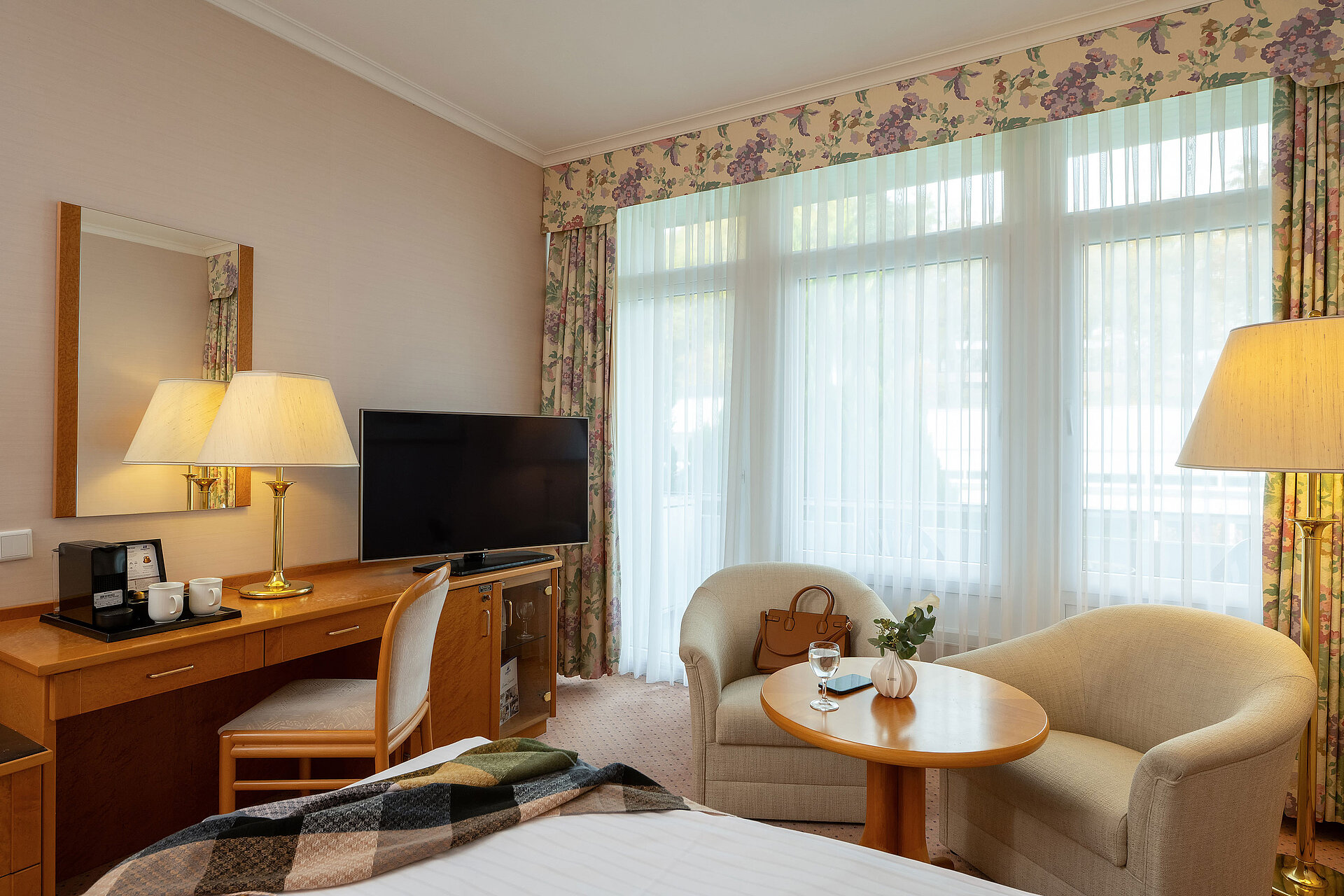 Ein Paradestück außergewöhnlicher Bäderarchitektur mitten im Grünen: das ist das Maritim Hotel Bad Wildungen. Umgeben größten Kurpark in Europa ist das Hotel ideal für alle, die nach Ruhe und Erholung suchen. Auch für einen Erkundungstrip ist das Haus günstig gelegen, denn es befindet sich fußläufig zur sehenswerten Altstadt. Weitere Ausflugsziele wie der 17 km entfernte Edersee im Landkreis Waldeck-Frankenberg, die Kleinstadt Fritzlar oder Kassel, die einzige Großstadt Nordhessens, sind schnell erreicht. Gerne stellen wir Ihnen vom Hotel aus entsprechende Ausflugspakete zusammen, auch für Gruppenreisende und Veranstaltungsteilnehmer. Tagungen, Seminare und Feiern finden gerne in der ruhigen Atmosphäre des Hotels statt und die grüne, umgebende Natur lässt kreative Ideen nur so sprudeln.