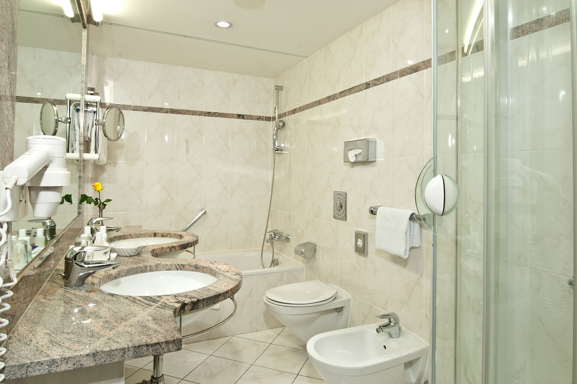 Zum Portfolio gehören auch Zimmer mit Verbindungstüren für alle die zu zweit anreisen, aber alleine schlafen möchten. Diese befinden sich auf der Kurparkseite auf den Etagen 2, 4, 6 und 8 und auf der Seeseite auf den Etagen 3, 5, 7 und 9.