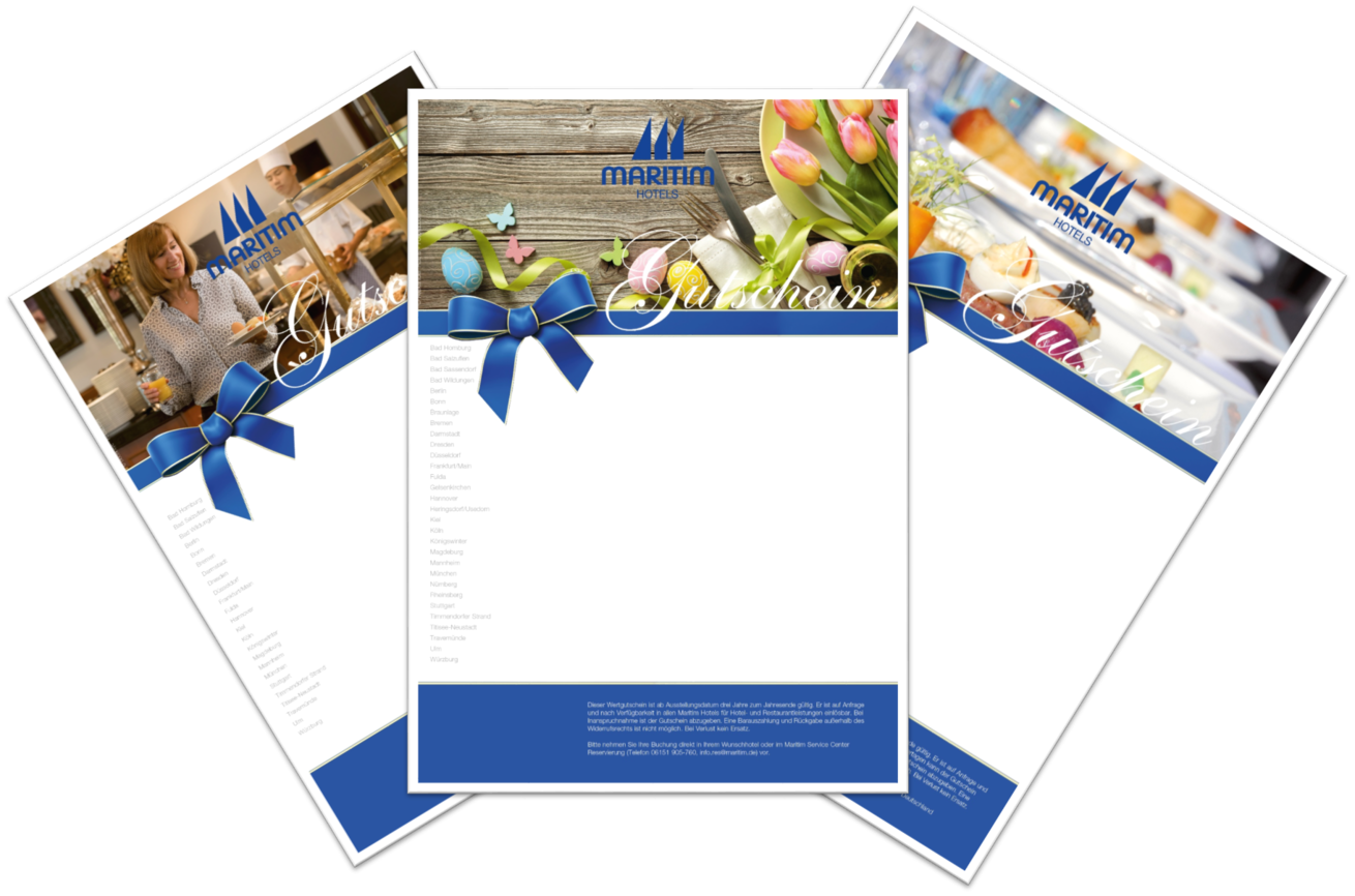 Verschenken Sie einen Maritim Gutschein, entweder über einen freiwählbaren Betrag oder über die Teilnahme am reichhaltigem Maritim Frühstücksbuffet.
